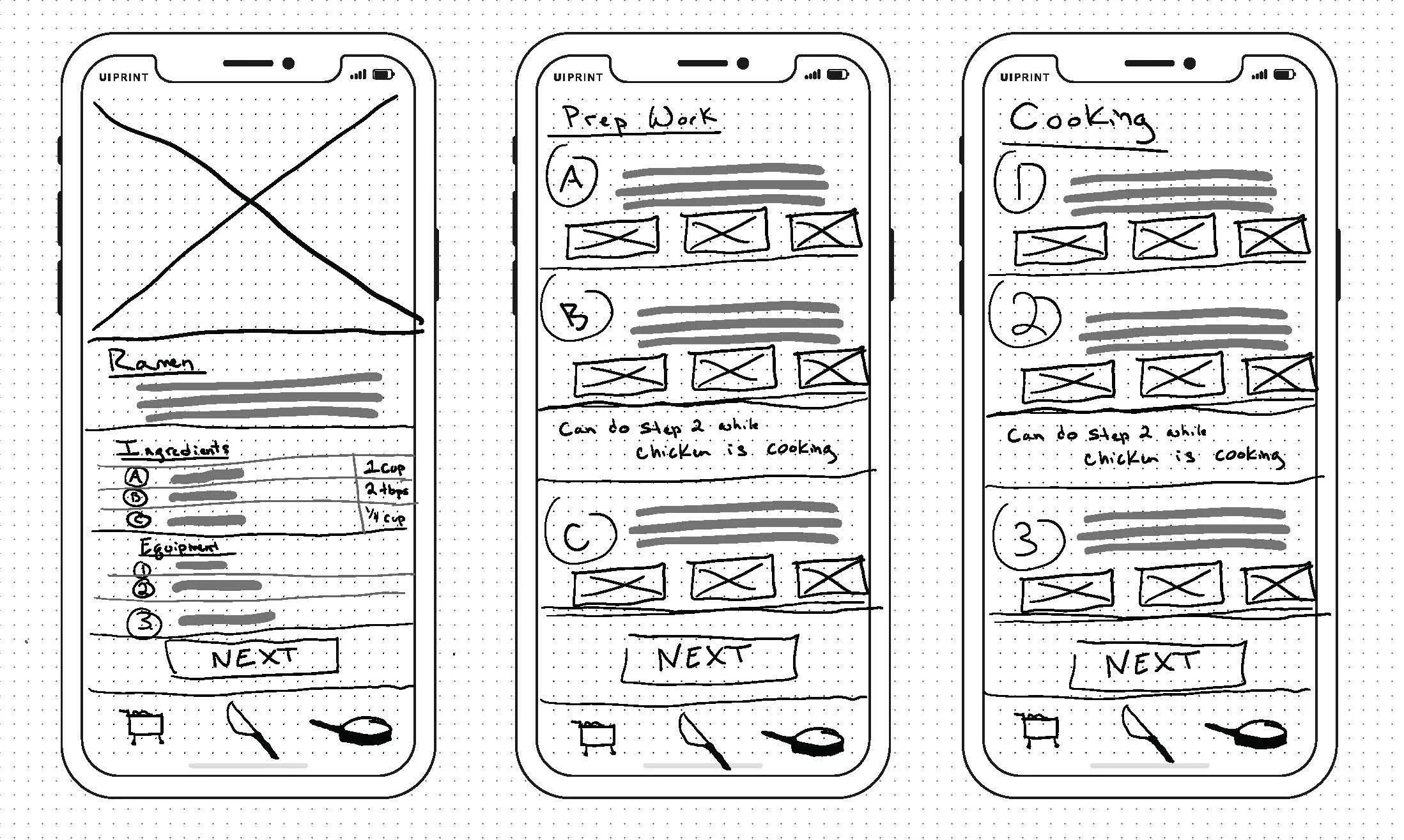After iterating on the most critical screen, I followed up that exercise by drawing a storyboard of the user’s experience. This storyboard starts by the user choosing a recipe and then reading the important elements such as it’s level, time, and serving size. Next, they check off each ingredient when they are done and click on ingredients that they are unfamiliar with for more context. Once they have taken out all of their ingredients they begin reading the prepping instructions. If they are unfamiliar with a step, they are able to reference the image below and check it off when they are done. They then move on to the recipe and continue checking off steps as they go.